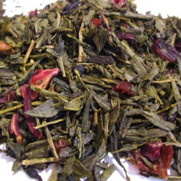 Groene thee met hibiscus, rozebottel, appel, zwarte bessen, sultanarozijnen, vanille en aroma.